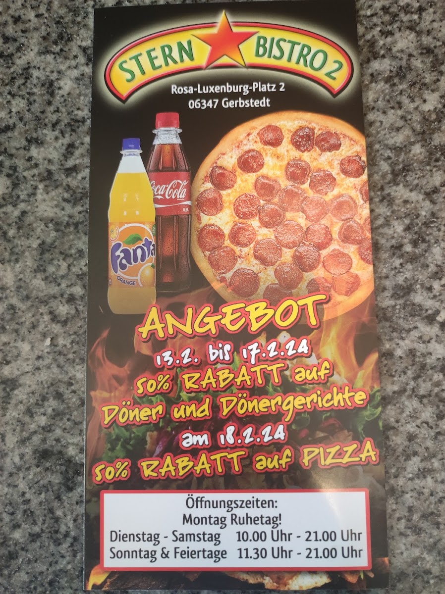 Introducing STERN BISTRO 2, a delightful doner kebab restaurant located at Rosa-Luxemburg-Platz in Gerbstedt, Germany. This charming bistro impresses with its warm ambiance, making it a perfect dining spot for families and friends alike. Customers rave about the friendly and attentive staff, ensuring a pleasant dining experience without long waits. The menu is diverse, catering to various tastes, featuring mouthwatering doners, fresh pizza, and delectable pasta dishes that have earned rave reviews. The standout, however, is the rich selection of house-made sauces, enhancing each dish's flavor profile. Visitors consistently express satisfaction, praising the fresh ingredients and generous portions, striking a balance between quantity and quality. Whether you're a local or just passing through, STERN BISTRO 2 offers a culinary experience that reverberates with every bite, making it a must-visit destination for food lovers in the area.